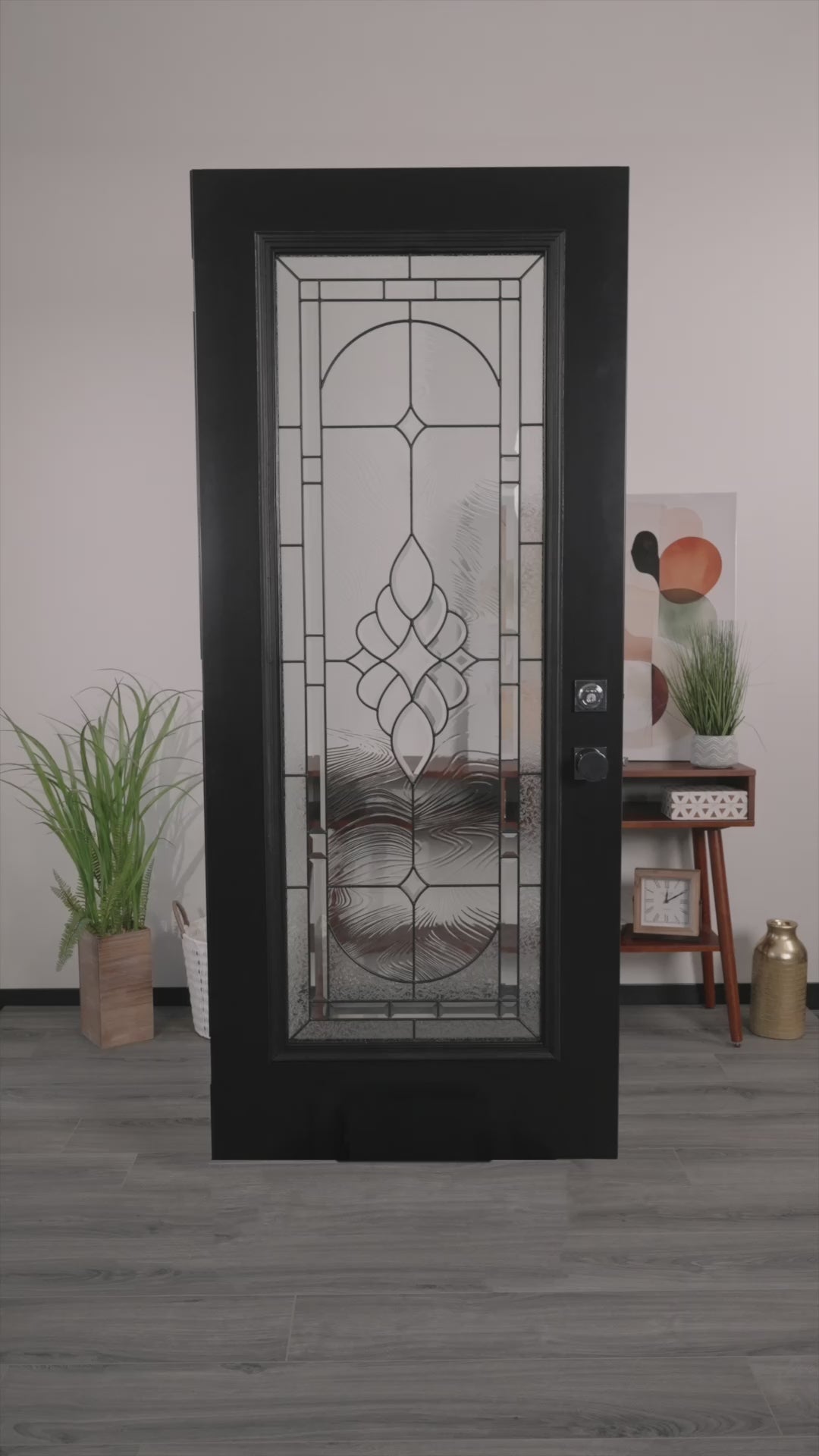 The Saxon design is the most elegant and refined decorative glass style that we offer. It contains ornate bevels, intricate textures, and a breathtaking central cluster that helps a door make a strong first impression. Available in black (lead/patina), brass, and nickel caming. This glass style offers more visibility relative to privacy, thanks to the large central cluster composed of clear beveled glass.