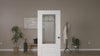 Flush glazed doors feature glass that is permanently integrated directly into the door slab rather than mounted inside a removable frame. This construction creates a sleek, streamlined appearance with a larger visible glass area and fewer visible trim components, allowing decorative glass designs to stand out while maintaining a clean, cohesive look across the door surface.