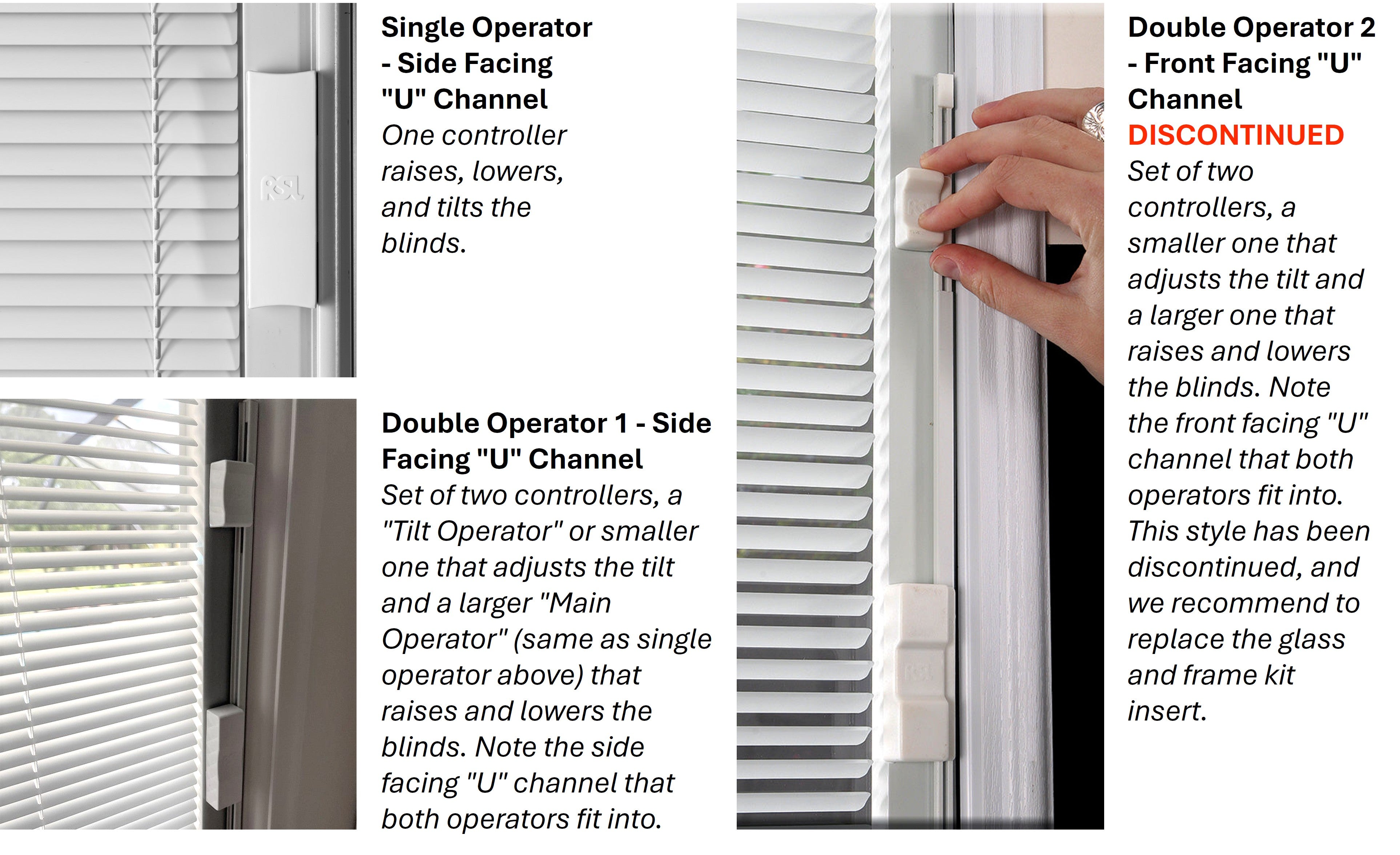 Set of two controllers, a smaller one that adjusts the tilt and a larger one that raises and lowers the blinds. Note the front facing "U" channel that both operators fit into. This style has been discontinued and we recommend to replace the glass and frame kit insert.